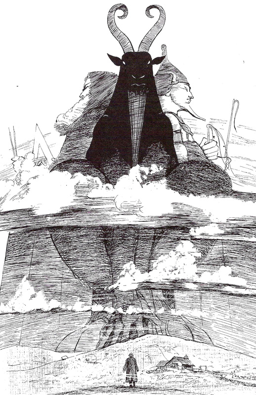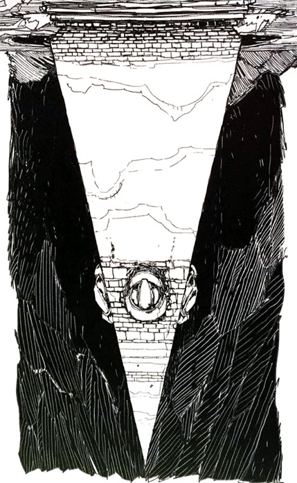 Clouds gather and the whole scene is smothered by the gathering dark. The light emanating from the child's eyes dies as the golden hall melts in the distance and morphs into a long hard tower of black volcanic glass. Screams of pain and distant wailing rise as a cold new dawn reveals the bleak surroundings of the tower. Crows fly overhead, thousands of bodies surrounding the base of the promontory where the tower rises defiantly towards the thick, swirling clouds above.